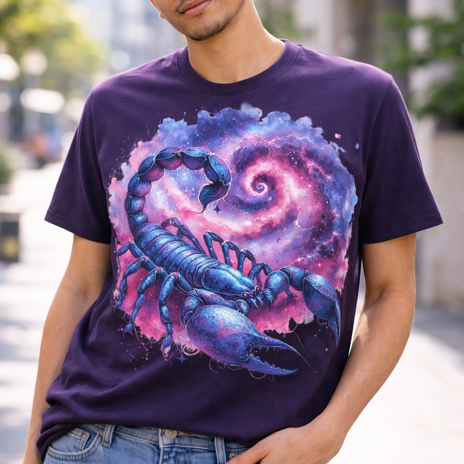 Turn up the intensity with this bold Scorpio design—an electric blue scorpion crawling across a swirling galaxy of pinks, purples, and deep space vibes. Printed on a deep purple tee so the colors pop and stay rich, this one is perfect for Scorpio season, astrology lovers, and anyone who loves edgy cosmic artwork with serious attitude.