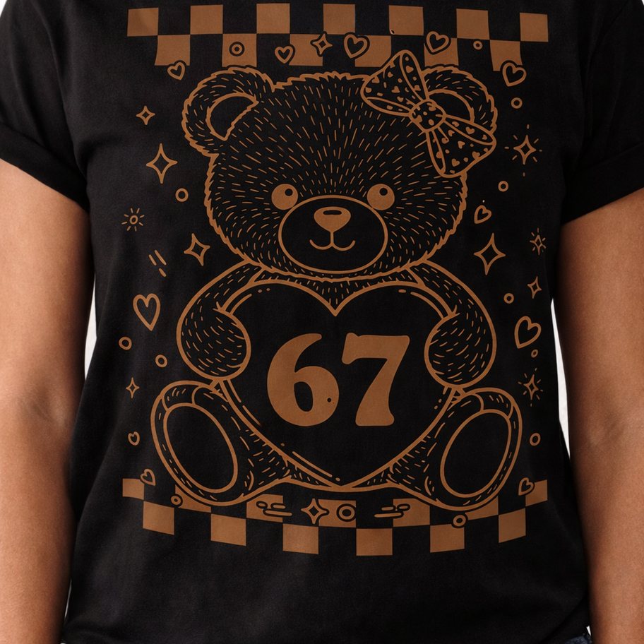 A cute vintage-style teddy bear design featuring the number 67, accented with hearts, bows, and checkered details. Printed on a soft Gildan unisex t-shirt for a comfortable everyday fit. Perfect for birthdays, memorials, special years, or anyone who loves cozy nostalgic designs.